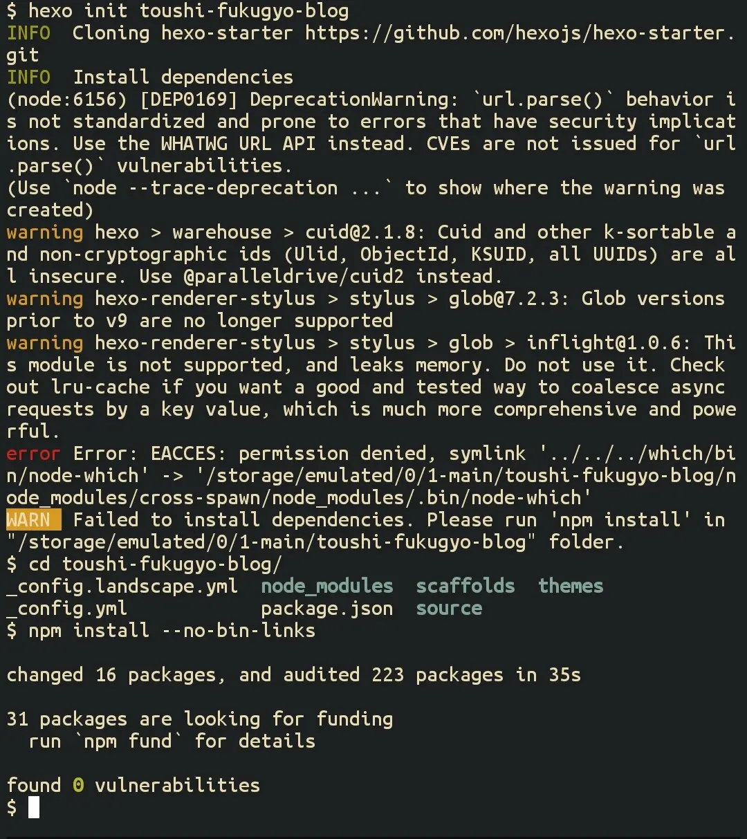 Termux環境ではシンボリックリンク作れないので、出るのはしょうがないエラー。